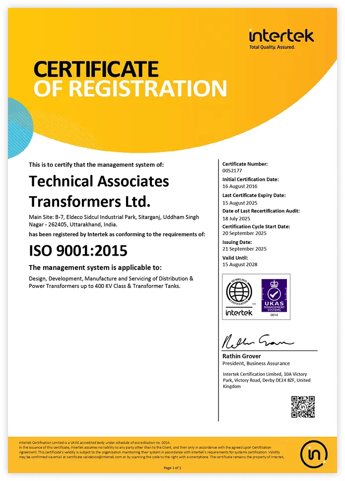TATL holds globally recognised certifications that validate our precision-led manufacturing and testing practices, ensuring consistent quality, proven reliability, and adherence to international standards across all transformer classes.